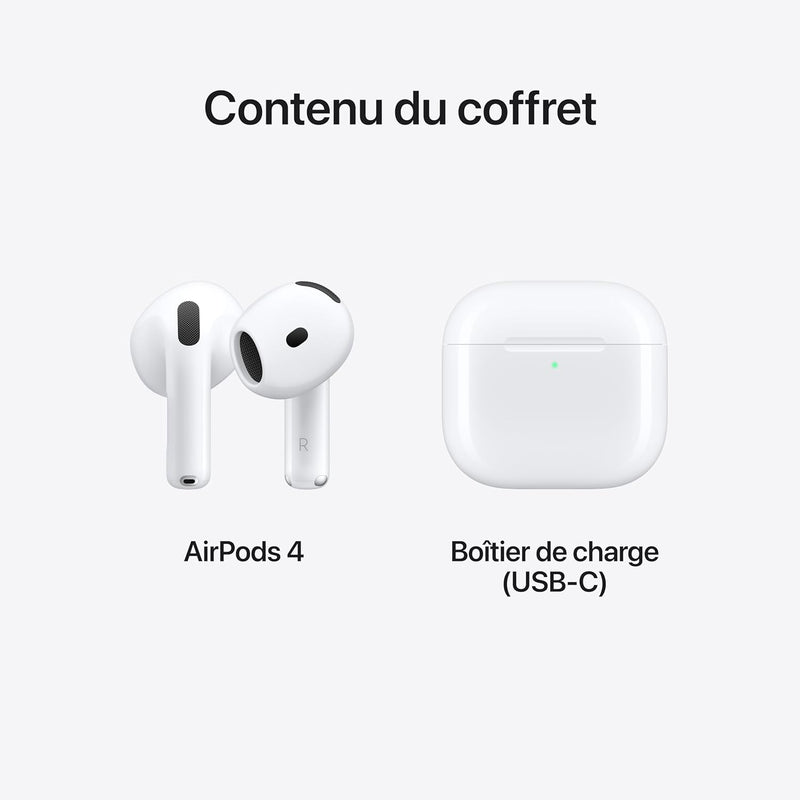 • Composants inclus: AirPods 4, Boîtier de charge (USB-C),(Câble USB-C vendu séparément)